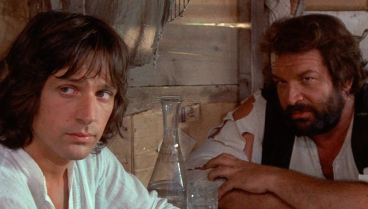 Roberto risulta essere del tutto incapace a reagire anche in questo caso estremo e anche in questo caso demanda la sua salvezza ad altri, precisamente all’amico Dio(mede),interpretato da Bud Spencer. Con la sua entrata in campo, Dio fa fuggire l’assassino verso il suo drammatico finale. In quest’ottica, ‘Quattro mosche di velluto grigio’, si può considerare un esperimento filmico teso alla ricerca di quel delirio estremo che si perfezionerà qualche anno dopo nel film “Profondo Rosso”.