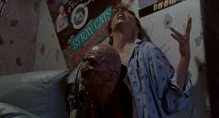 Jesse, consapevole della sua condizione di “posseduto” entra in camera di Ronnie, chiedendogli di tenerlo d’occhio, di sorvegliare le sue mosse, ma in realtà è troppo tardi, in quanto Ronnie non prende sul serio le parole di Jesse e si abbandona al sonno. Freddy, approfittando della debolezza di Ronnie, si fa largo, fisicamente, nel corpo di Jesse. La scena è struggente e spettacolare allo stesso tempo, divisa tra il dolore provato da Jesse e gli effetti “carnali” messi in scena. Una sequenza di grande impatto visivo per l’epoca, nonostante i mezzi limitati di cui godeva la pellicola. Dalla mano di Jesse, dalle sue dita, iniziano a spuntare le mortali lame del guanto di Freddy, e mentre il ragazzo urla tutto il suo dolore nel fondo della sua bocca vediamo aprirsi un occhio di Krueger, intento a controllare la situazione.