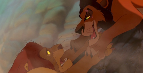 Nella famosa sequenza della carica degli gnu, vediamo Scar essere preciso regista di tutta l’azione, mentre gli altri personaggi diventano gli attori, le marionette che agiscono secondo quanto lui aveva pianificato. Nel momento estremo lo vedremo godersi ogni istante: dall’alto della rupe osserva la valle sotto di lui, un brulicare di zoccoli impazziti, una mandria enorme in folle fuga. Subito sotto di lui Mufasa aggrappato alla parete con gli artigli, lottando per non precipitare in quel mare di pelo fulvo che scorre impetuoso senza controllo. Scar lo fissa, impassibile, osserva ogni tentativo di Mufasa per riuscire a risalire il fianco ripido della gola, assapora ogni sforzo del fratello, ogni ansimo di fatica per riuscire a sopravvivere, prolungando di fatto l’attesa dell’atto finale. Mufasa lo supplica, lo chiama fratello, come a voler rinsaldare quel legame familiare, non può pensare che Scar, sangue del suo sangue, lo voglia morto. Poi l’affondo.