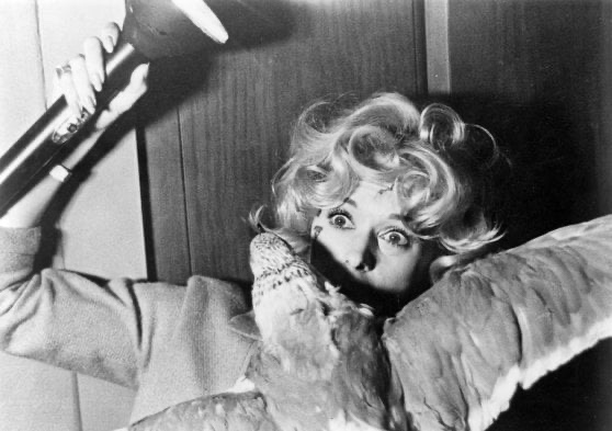 La bravura della Hedren si può ammirare soprattutto nella sequenza finale, quando, entrata in una stanza del piano superiore di casa Brenner, viene aggredita da uno stormo di gabbiani penetrati nella stanza attraverso il tetto sfondato. L’assalto dei gabbiani a Melania riporta alla mente dello spettatore l’omicidio di Marion in “Psycho”: alternanza frenetica di immagini e dettagli che suggeriscono, più che mostrare, la violenza subita dalla ragazza. Sarà dopo questo violento assalto che Lidya, ormai lasciate cadere le barriere di diffidenza verso Melania, la stringerà a sé per proteggerla, ferita e sotto shock, nella scena finale dell’abbandono della casa verso un futuro incerto.