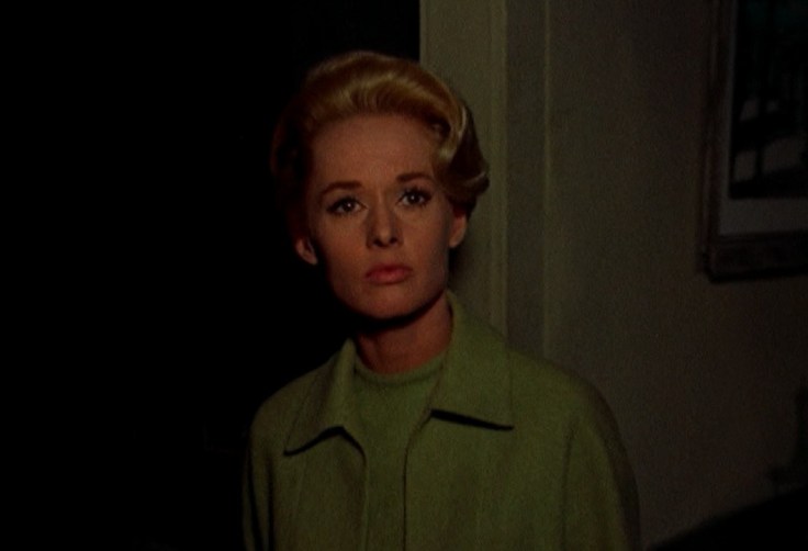 É esemplare la costruzione della scena dell’assalto dei corvi alla scuola. Melania attende l’uscita dei ragazzi dall’edificio seduta su una panchina. Dietro di lei una struttura di tubi in acciaio, nel parco giochi dei bambini. In un montaggio alternato vediamo Melania intenta a fumare mentre attende, poi stacco sulla struttura sulla quale si vengono a posare alcuni corvi. Alla fine Melania segue con gli occhi un corvo in volo, fino a che non lo vede posarsi sulla struttura ormai gremita da centinaia di corvi. Una scena suggestiva. Spesso Alfred Hitchcock utilizza il montaggio per dare dinamicità agli eventi, velocizzando ma al contempo dilatando i tempi, frammentandoli. In un’altra sequenza i gabbiano si gettano sul villaggio portando caos e panico ovunque. Da una finestra, con quattro immagini fisse di Melania (ma ripresa ogni volta con la testa spostata come se si fosse girata), la vediamo atterrita osservare un incendio correre verso una pompa di benzina provocando un’esplosione mortale per alcuni abitanti. La faccia di Melania è rigida, la bocca aperta in un urlo muto. Lo stesso urlo muto che emetterà Lidya dopo aver scoperto il cadavere martoriato di un contadino suo vicino, al quale gli uccelli hanno anche strappato gli occhi. Stessa terribile sorte che toccherà ad Annie Hayworth (Suzanne Pleshette) ex compagna di Mitch e anche lei entrata nelle mire di Lidya.
