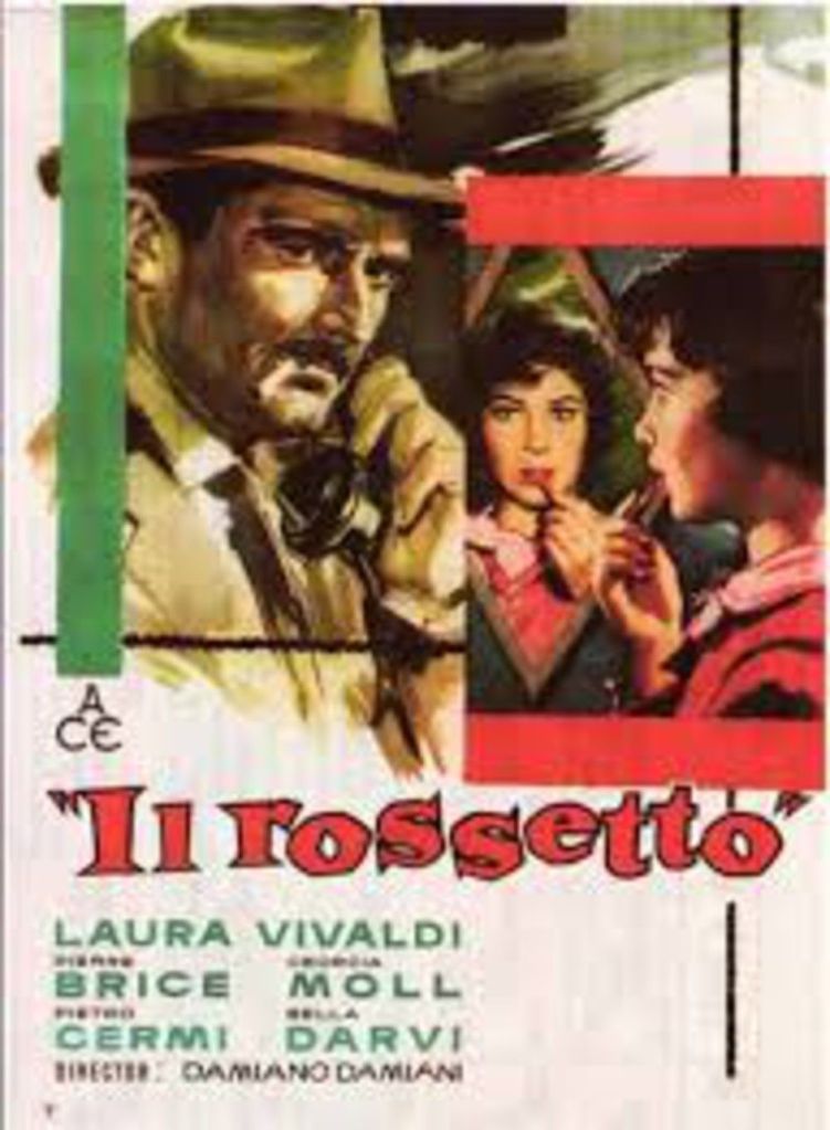 Dopo un passato come sceneggiatore e documentarista (La banda d’Affori, 1947 Le giostre, 1954) nel 1960 Damiano Damiani passa alla regia firmando il suo primo lungometraggio: Il rossetto. Un esordio audace e sorprendente per un giallo “atipico” velato di sottili e penetranti sfumature horror. Ispirandosi ad un reale fatto di cronaca il regista friulano con la complicità di Cesare Zavattini realizza un’opera graffiante e corrosiva capace di gettare un velo di luce sinistra sulle celate contraddizioni di un paese colto nel pieno di un irripetibile boom economico. Silvana (Laura Vivaldi) è un’ irrequieta e curiosa tredicenne segretamente innamorata di Gino (Pierre Brice) il suo dirimpettaio rappresentante di commercio e appassionato di musica. La fanciullesca passione per un tipo fascinoso molto più grande di lei si risolve in maldestri tentativi d’approccio e infruttuosi appostamenti andati a vuoto, puntualmente sbeffeggiati dalle sue (presunte) amiche. Un giorno la ragazzina vede uscire l’uomo da un appartamento dove poco dopo viene rinvenuto il corpo senza vita di Grisbi’,una prostituta brutalmente assassinata. Le indagini vengono affidate al commissario Fioresi (Pietro Germi) e portano nell’immediato all’incauto arresto di un ingenuo garzone di bottega. Nel frattempo Gino per evitare la pericolosa testimonianza di Silvana, comincia ad assecondare i suoi capricci fino a quando il semplice, ma (per l’epoca) sconsiderato uso di un rossetto finirà per metterla seriamente nei guai.