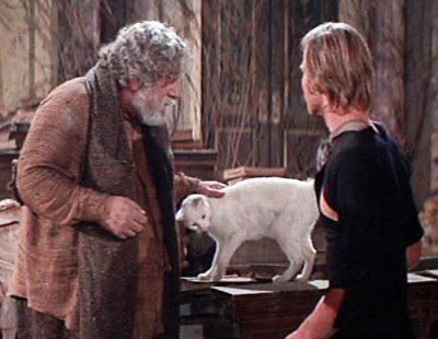 Qui comincia la parte più bella del film. Il vecchio è uno straordinario Peter Ustinov che dà un tocco di vera recitazione a tutto il film e riporta storia e sentimenti a una dimensione umana. Meraviglia e stupore dei due che, oltre a non aver mai visto un vecchio, non hanno mai visto un gatto, e dolcezza da parte del vecchio che si vede finalmente rompere la propria solitudine. È un vecchio un po’ sbadato, dall’aspetto di un barbone, che non si stupisce più di niente, e che li accoglie come la cosa più normale che potesse succedergli dopo anni di solitudine. L’idillio è interrotto da Francis 7, che rappresenta l’ortodossia del regime e che li ha seguiti fin lì.