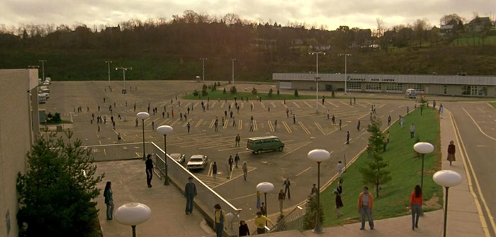 Il centro commerciale, da semplice location, diventa ben presto il vero protagonista, fulcro della pellicola. Romero mette in atto una feroce critica della società americana. I quattro protagonisti si barricano all’interno del centro commerciale, ripulendolo dalla presenza degli zombi, trasformandolo nella loro roccaforte. La presenza quasi illimitata di merci a loro disposizione li convince a rimanere lì. Un universo chiuso ed autosufficiente nel quale cercano di ritrovare una parvenza di normalità, un ritorno ad una quotidianità che è solo di facciata. Questo crea un equilibrio tra i personaggi, nei quali non si trova traccia di ostilità reciproca, ma al contrario una collaborazione che li porta ad una quiete esistenziale, difficile da creare nella situazione limite in cui l’umanità è precipitata. Proprio la disponibilità di beni frena qualunque genere di competizione intestina per la supremazia. Ma la libertà conquistata è una falsa realtà. Di fatto i quattro sono prigionieri delle mura del Mall, mentre gli zombi, all’esterno dell’immenso parcheggio, aumentano, attirati dalla “merce” che si trova all’interno.