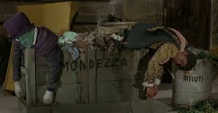Eppure qualcosa di questa “pura realtà” pasoliniana resta proprio in questa incorruttibilità della vita che poi non è che l’innocenza, e che facilmente coincide con un non adattamento fiero e a volte inconsapevole, laddove ancora nulla si è lasciato sporcare e piegare dal peccato della modernità. I burattini forse non sono davvero puniti tra i rifiuti, (per una colpa nemmeno commessa), se sopra il bidone dove vengono stipati si trova scritta, sorprendentemente, una parola che sa assumere significati opposti: “MONDEZZA” che ha il senso di purezza e insieme, per una storpiatura, il suo senso opposto.