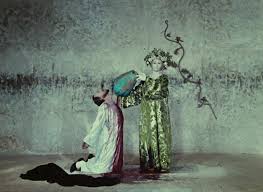 La presenza di oggetti costanti, l’importanza dell’abito e quella dell’acqua fanno parte in realtà di un rito; la vita di Sayat Nova è infatti una grande rappresentazione sacra che fonde simbolismo e surrealismo con le tradizioni cultuali dell’Armenia. Se il dialogo come si diceva è ridotto all’osso, questo è anche perché si tratta forse di un lungo dialogo con dio o con l’alterità che il poeta intrattiene, anche quando le parole sono parole d’amore all’indirizzo della propria musa. Ma anche questa sembra essere compresa in questo processo dell’indiarsi. Come in ogni rito ci si sveste e ci si riveste, come in ogni rito si maneggiano oggetti, come in ogni rito, il corpo diventa corpo artificiale, protesi o prolungamento “dell’altra vita”, che sia poesia o che sia quella della Salvezza divina dove anche il gesto è un salmodiare. La morte anche è mitigata dalla pragmaticità dell’icona-simbolo (l’angelo della morte) e dalla catarsi continua che il rito concede.