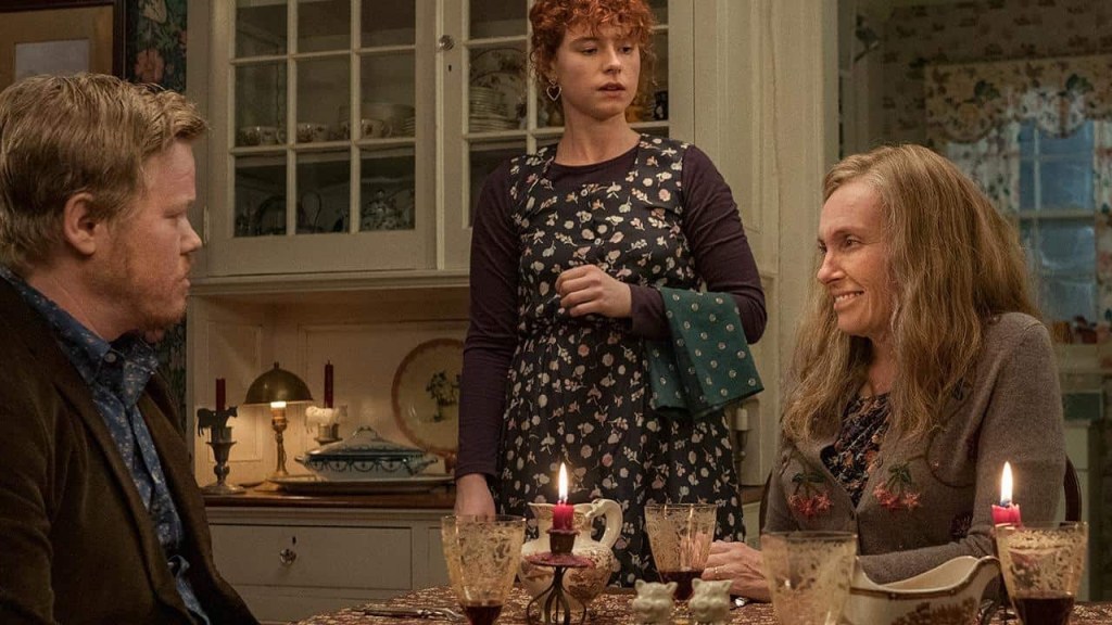La seconda parte del film si sposta nei territori dell’horror psicologico con echi di lavori di Shyamalan e Peele. La tranquilla fattoria “nel mezzo del nulla” dove abitano i bizzarri genitori di Jake (splendida come sempre Toni Collette) diventa un luogo di inquietudine e spaesamento, casa di bambole che nasconde ricordi, memorie e segreti. Il vecchio bidello continua a sbucar fuori in modo decontestualizzato, macilento e piegato dal suo lavoro di pulizia e di ‘guardone’ della dinamica vita scolastica di cui è elemento marginale, invisibile e malvisto; un cane che c’è ma poi non c’è più e la visita alla stalla, gli agnelli morti sulla porta della stessa e la storia dei maiali rosi in vita dai vermi, tutto anticipa la sensazione di morte e putrefazione che si respirerà nel film da questo momento in poi. Alla tela bianca, la neve, totalmente da inventare e dipingere della prima parte del film, si sostituisce un interno colorato e curato, ricco di elementi che richiamano il passato di coloro che vi vivono o vi hanno vissuto.