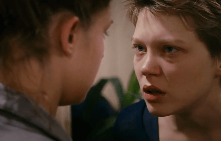 L’elemento linguistico e narrativo del film è costituito dalle lunghe, ravvicinatissime inquadrature su corpi, visi, sguardi, oggetti. Il regista si sofferma su ogni dettaglio del viso e su ogni gesto di Adèle, ad esempio quando, bulimica di cibo, libri, vita (e amore), trangugia scompostamente la cena o ascolta assorta la suggestiva lezione del suo professore di letteratura su La vita di Marianna di Pierre de Marivaux. Primi piani insistiti sugli occhi – sguardi talvolta estranei talaltra intensi – sui gesti e sull’andatura, goffi e poco eleganti, sui capelli sempre scarmigliati e sui rari, luminosi sorrisi: il vitalismo di Adèle, ancor prima e ben più che nelle tanto discusse scene di sesso, è tutto qui. Il sesso è nel film ‘lingua’ di un ragionamento ampio e articolato sulle fasi dell’amore e sulla sua portata trasformativa, ragionamento che il cineasta può dipanare grazie alle due eccellenti protagoniste: riprendendone i corpi con i movimenti di macchina sicuri del regista d’esperienza, Kerchiche ottiene un effetto di grande realismo.