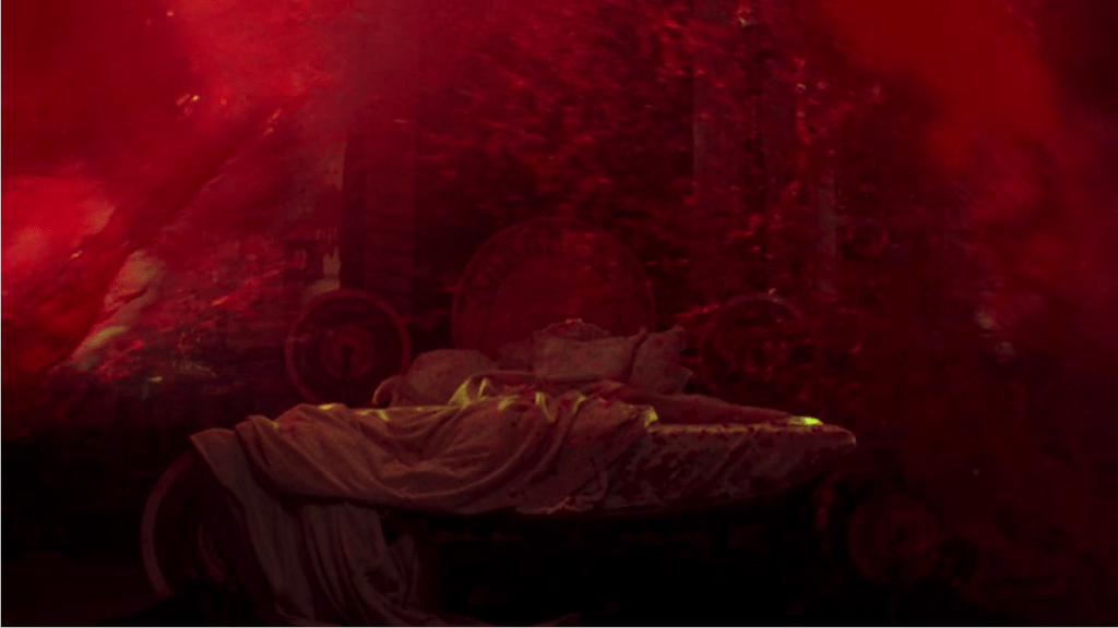 mostrando anche, in un’inquadratura, quella che era stata l’antesignana del cinema, la lanterna magica, quando nella sequenza proprio all’interno del cinema, vediamo una donna trasformarsi in uno scheletro. Ma è anche una sorta di ammonimento per i personaggi. Mina e Dracula sono in qual cinema, mentre un lupo, fuggito dallo zoo, irrompe nella sala portando il panico tra i presenti. Dracula comanda la lupo di fermarsi, ed invita Mina a carezzarlo, lei cede a quel gesto, e carezza l’animale con passione. Il momento in cui cede all’amore passionale per il suo principe è sancito in questo gesto.