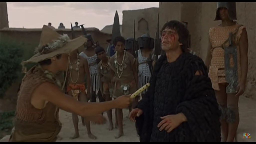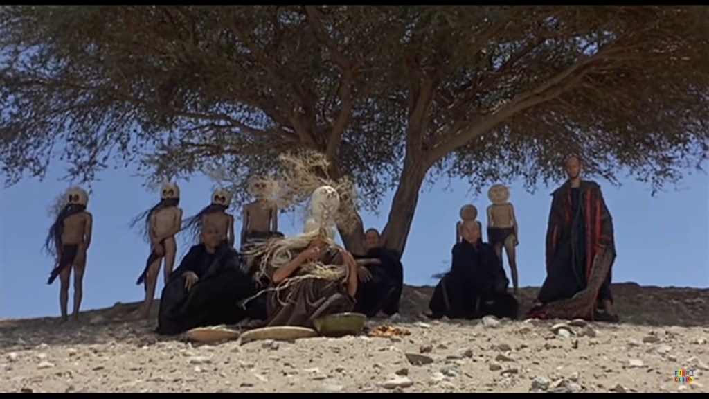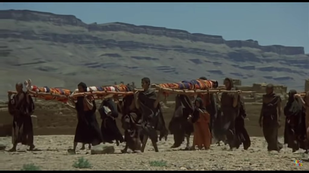 Non a caso la luce di questo film è abbagliante. La tragedia avviene sotto il sole, nel deserto, mentre la colpa si espia con il buio: buia è la camera da letto in cui si uccide Giocasta, la stessa camera in cui Edipo si acceca. Addirittura Pasolini sceglie di filmare diverse scene con un violento controluce, come nella scena dell’omicidio di Laio e dei suoi uomini: la siluhette di Edipo, che solleva la spada prima di sferrare il colpo mortale alle sue vittime, scompare nel fascio abbagliante del controluce che investe l’immagine nel momento in cui egli dà la morte.