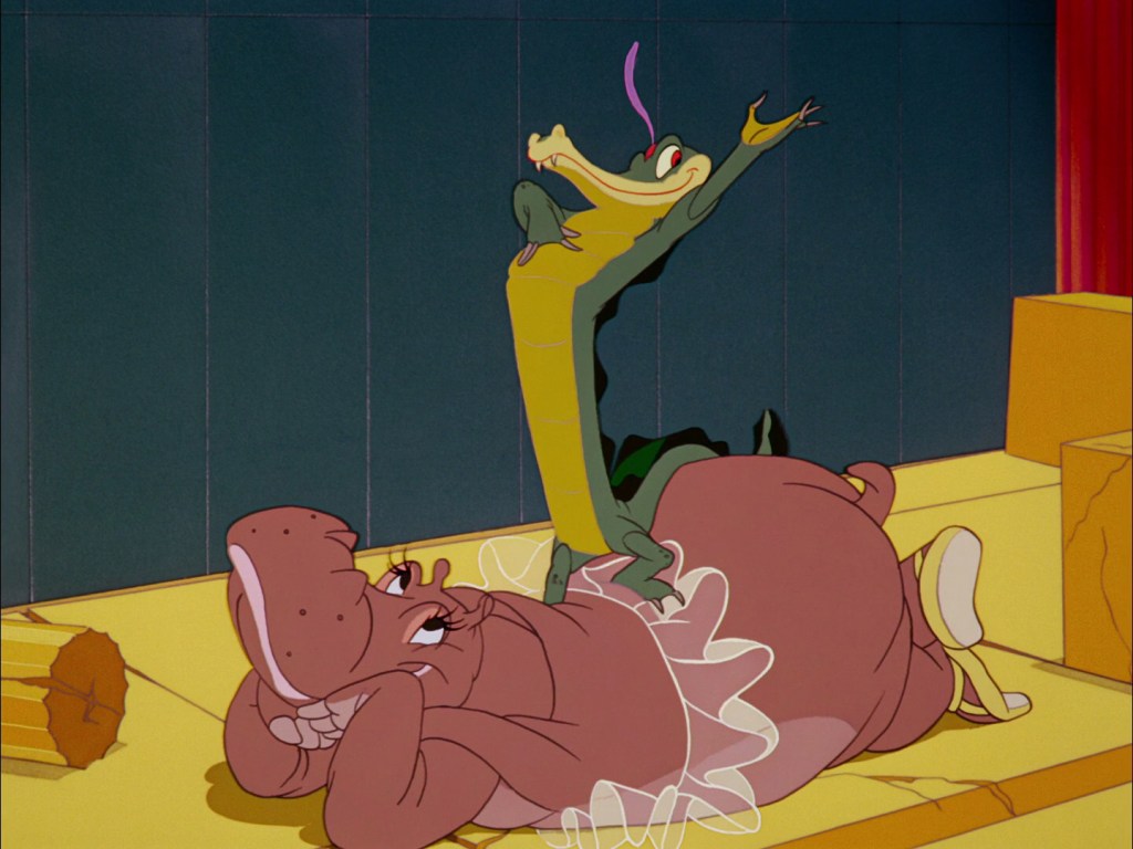 A questo segmento segue poi l’ironica “Danza delle ore” di Ponchielli. Un balletto classico interpretato da struzzi, ippopotami, elefantesse e coccodrilli, tutti impegnati a rappresentare i quattro momenti del giorno. Disney però sapeva che il divertimento sarebbe mancato se i movimenti dei personaggi non fossero stati realistici, quindi invitò gli animatori a studiare i passi di danza di vere ballerine classiche. Ne risulta una sequenza divertente e spassosa.