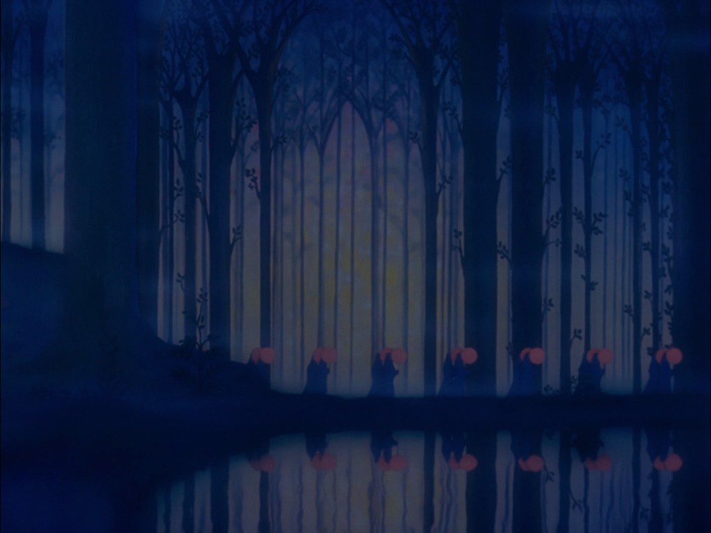 Ma come sempre tutto ha una fine, e anche l’orgia diabolica giunge al termine, mentre nell’aria suonano le campane della chiesa che annunciano l’approssimarsi dell’alba, del sole salvifico. Ed ogni rintocco di campana lancia un bagliore che quasi acceca Chernabog. L’alba porta con sé la speranza di una rinascita nel Bene simboleggiato dalla luce; parte così la dolce musica dell’Ave Maria, in una sequenza eccezionale in quanto tutto il finale di questo episodio risulta essere un’unica sequenza in carrellata, con la macchina da presa che penetra nel buio di una foresta/cattedrale verso uno spiraglio di luce in fondo all’immagine che, lentamente, si allarga a mostrare una foresta dai colori brillanti, i cui rami vanno a formare le arcate di una chiesa della Natura che diventa così un simbolico tempio dove l’uomo può entrare in contatto con il divino. Una sequenza stupenda realizzata dipingendo le scenografie su lastre di vetro, una dietro l’altra, poste in verticale, verso cui l’obbiettivo della telecamera carrella per dare il senso della profondità.