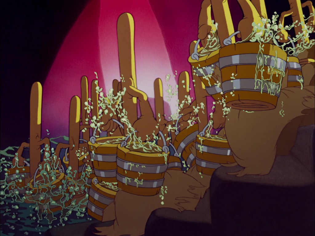 Viene poi il momento del celebre “Apprendista Stregone” di Dukas. Topolino, allievo di un mago chiamato Yen Sid (e si suggerisce di leggerlo al contrario per capire il gioco di parole), decide di usare il cappello magico del suo padrone per poter svolgere con più facilità i lavori domestici. La magia sfugge però alle sue mani inesperte, causando l’allagamento del castello. Solo l’intervento del potente Yen Sid potrà rimettere a posto le cose. Il cortometraggio è perfetto. Topolino, rinnovato nell’aspetto, si muove in un ambiente che dosa sapientemente zone di oscurità e di luce. Le animazioni sono estremamente ricche, quando Topolino nel suo sogno di onnipotenza immagina di comandare gli elementi, ma soprattutto nella seconda parte del cortometraggio, quando un esercito di scope irrefrenabili continua a versare acqua all’interno delle sale del castello. Animazioni complesse per l’epoca, con le centinaia di scope, con i giochi d’acqua, le onde, i turbini. Un vero kolossal in miniatura per il rilancio di Topolino.