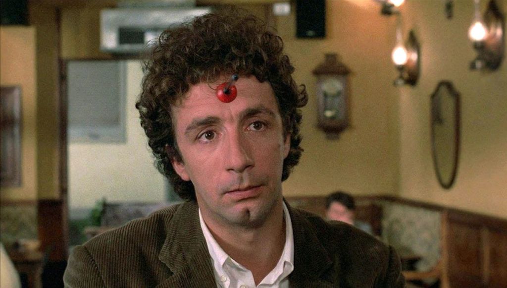 Insieme al fido Giovanni Veronesi e David Grieco parte per Los Angeles in cerca d’ispirazione. L’esilio a stelle e strisce disattende le aspettative, ma offre una solida base sulla quale innestare le fondamenta di una storia d’amore folle, surreale, travolgente, ma attenzione, pericolosamente vicina alla realtà. L’idea iniziale ruota intorno ad un insospettabile film di Sidney Lumet Quel pomeriggio di un giorno da cani e se da una parte quel riferimento cinematografico si rivela puro espediente narrativo, dall’altra rappresenta l’input per la costruzione di una scena tra le più significative della sua filmografia. Caruso Pascoski figlio di una madre/padrona e di un padre polacco muto e ostaggio dell’Unità è un apprezzato psicanalista felicemente sposato con Giulia (Clarissa Burt) sua predestinata femme fatale fin dall’infanzia. Una mattina che sembra uguale a tutte le altre, inizia con un misterioso sortilegio in cima alle scale “A che ora torni?” “A l’otto” per poi concludersi con la fine di un matrimonio “epocale”. Giulia scompare misteriosamente, non fornisce spiegazioni e ricompare in tribunale un mese dopo con la richiesta di divorzio. Una richiesta senza motivo apparente, se non quello di un amore giunto al capolinea anche per un’intensa e ormai insostenibile attività sessuale (fino a otto volte al giorno). In realtà il profondo blu dei suoi occhi nasconde la presenza di un terzo incomodo, Edoardo (Ricky Tognazzi, già antagonista di Nuti in Son contento), giovane problematico e paziente in cura da Caruso per presunta e poi confermata diagnosi di omosessualità. Le certezze di Caruso iniziano a vacillare e dopo un anno buttato alle ortiche tra sbronze moleste, ripetuti arresti e storie d’amore improbabili decide di firmare le carte, ma a quel punto Giulia ci ripensa dichiarandogli nuovamente il suo amore. Da coppia modello si trasformano in amanti clandestini consumando la “nuova storia” all’interno dei bagni di un cinema dove s’incontrano ogni pomeriggio alle tre. Tuttavia Giulia è una mina vagante ancora inesplosa e nonostante la separazione da Edoardo e il ritorno a casa con tanto di prole, il sinistro sortilegio continuerà a riproporsi.