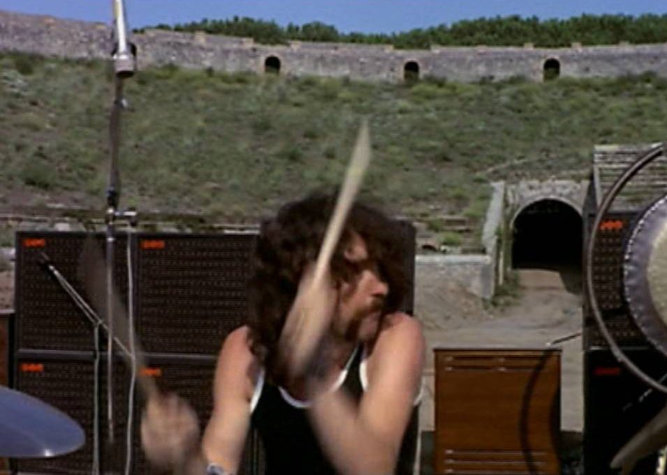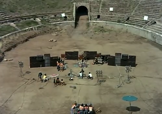 Narra la leggenda che lo scozzese Adrian Maben, in vacanza da quelle parti, tornato una sera in albergo si accorse di avere smarrito il passaporto. Suppose che gli fosse caduto durante la visita all’anfiteatro romano, e ci tornò poco prima del tramonto, restando impressionato dal silenzio che nel frattempo era calato sul posto, vuoto di persone, colmo di bellezza e di storia. Si ricordò della proposta che aveva fatto tempo prima al manager dei Pink Floyd, senza aver suscitato entusiasmi: un documentario in cui associare la loro musica così visionaria, immaginifica, alle opere di artisti celebri (Magritte, de Chirico). Formulò il nuovo progetto, che venne accolto. Non sappiamo se Maben recuperò il passaporto, ma l’infortunio gli ha sicuramente procurato altre soddisfazioni. La sua idea di concert film a porte chiuse, in totale opposizione al modello di Woodstock, condivisa dai Pink Floyd, fu quella giusta. Il gruppo era in una fase di transizione delicata: privo da tre anni della bussola psichedelica di Syd Barrett stava navigando verso un rock progressivo più morbido, con meno acidità (lisergiche), ma non aveva ancora definito compiutamente il proprio stile, quello che porterà alle vette artistiche e commerciali di The Dark Side of the Moon (1973) e di Wish You Were Here (1975). Pubblicato nel 1970 Atom Heart Mother, era in fase di incisione Meddle. Sono dunque le melodie di quest’ultimo, in particolare la malinconica suite Echoes, ad innervare la scaletta di Live at Pompeii. I quattro suonano a torso nudo o in maglietta, di giorno e di notte, senza tanti orpelli o effetti speciali. Vediamo alternarsi fotografie di paesaggi archeologici e tesori museali (statue, mosaici, bassorilievi), e sequenze di passeggiate per la Solfatara di Pozzuoli, là dove erano già stati immortalati Totò (47 morto che parla, Bragaglia 1950) e Ingrid Bergman (Viaggio in Italia, Rossellini 1954). Questa prima versione del film, solo musicale, fu girata in soli quattro giorni e dura un’ora. I committenti erano tre televisioni pubbliche: bavarese, francese e belga, una co-produzione che anticipava di vent’anni la benemerita sinergia franco-tedesca di ARTE TV.