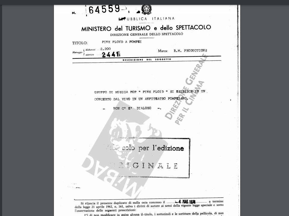 Fu già straordinaria la concessione di occuparlo in esclusiva per sei giorni di riprese. In quell’epoca, il mondo del rock progressivo era diviso in numerose fazioni: c’erano i fan degli Emerson Lake & Palmer, i discepoli dei Genesis, i fissati degli Yes, i seguaci dei Jethro Tull, i fedeli dei King Crimson, gli accademici dei Gentle Giant, tante altre autorevoli scuole ed eresie si contendevano le arene. Evidentemente i funzionari responsabili dei nulla osta pompeiani erano devoti dei Pink Floyd. Chi scrive era un mercenario agnostico, cane sciolto che annusava qua e là ogni gruppo, scambiava i vinili a Porta Portese tenendosi il meglio, registrava il resto su audiocassette, che tuttora emettono suoni. Quando uscì nelle sale, non c’era dubbio che questo film fosse un evento da non perdere, unico nella storia dei Pink Floyd, del rock, del cinema musicale. Da manuale anche per quanto riguarda l’evoluzione della fruizione di massa dei luoghi museali: un’intera generazione, grazie ad un concerto a porte chiuse di un gruppo rock inglese, scoprì il fascino dell’area dei Campi Flegrei e mise in agenda una visita agli scavi di Pompei, che tuttora beneficiano di questo colpo di fulmine tra musica e storia bimillenaria mediato dal cinema. Un vero miracolo, tanto più che Pink Floyd: Live at Pompeii è uno e trino: il regista ne confezionò tre edizioni, più corollari vari, come vediamo di seguito.