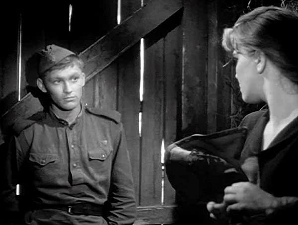 Il primo incontro è con un soldato che va in prima linea e gli chiede il favore di passare a casa sua, lungo il tragitto, per rassicurare la moglie e consegnarle uno strano regalo improvvisato: del sapone militare. Già dall’inizio il film prende un ritmo alto, con cambi di scena frequenti e battute stringate tra sconosciuti, da road movie picaresco. Insieme ad un bianco e nero ben studiato, talvolta espressionista, la sceneggiatura fluente e veloce esalta il contrasto tra la generosa vitalità di Alioscia, impaziente di arrivare a casa ma sempre curioso e attento verso chi lo circonda, e la cappa di stanchezza, ansia e indifferenza calata su tutti gli altri, militari e civili, stremati da una lunga guerra diventata ormai insopportabile. Il sorriso ingenuo del giovane soldato illumina i visi cupi e scoraggiati di tutti quelli che avranno a che fare con lui. È una storia commovente, ma anche ironica, che parla senza troppa retorica di ferite profonde, allora non ancora rimarginate.