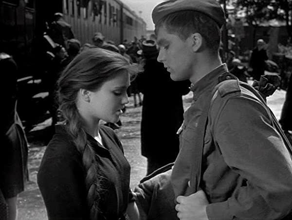 Il terzo incontro avviene, insieme ad altri minori (una sentinella corrotta, un tenente saggio) nel treno più fortunato per il soldatino: quello in cui entra Shura (Žanna Prochorenko), una ragazza gentile come Alioscia, anche se meno ingenua. I due sono fatti l’uno per l’altra, ma non se ne accorgono subito, sono troppo timidi; comunque si arrenderanno presto all’inevitabile intesa. La dolcezza semplice di Shura, tenera e paffutella come la figlia del capitano di Aleksandr Puškin, aggiunge intense note liriche alle altre qualità del film e finalmente ridimensiona in Alioscia, almeno per un giorno, il pensiero dominante per la madre. Le molte figure femminili che arricchiscono la sceneggiatura fanno di questa storia un film non maschiocentrico, sebbene girato da un uomo e con un uomo in fieri come protagonista. Un film che sfugge miracolosamente alla solita retorica eroico-patriottica.