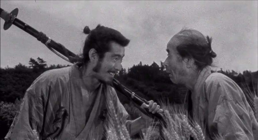 C’è un termine giapponese molto significativo per definire la gente che non fa parte della famiglia: soto, ovvero estranei, persone di fuori. Kikuchijo è di origini contadine, non è un samurai ma lo diventerà, ma il suo essere soto si riscontra nel suo modo di essere. Se gli altri sei vivono nel silenzio e nel controllo di se stessi, lui vive nel caos, fa capriole, mostra il sedere ai banditi, fa smorfie, corre a zig zag. Si interessa alle forme più appariscenti, cerca l’onore e non lo disprezza. Se Kambei si allontana dalla folla festeggiante dopo l’uccisione di un malvivente, Kikuchijo si sostituisce a lui e riceve al suo posto i “bravo” e gli “evviva”. È lo sguardo di chi desidera: non solo desidera diventare samurai ma segue anche con trepidazione il sesso femminile annusando il kimono della moglie di un contadino, spiando compiaciuto le gambe nude delle contadine durante la raccolta dell’orzo.