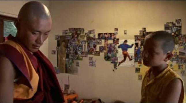 Coppa del Mondo 1998. La seguono con passione non troppo nascosta i giovani monaci – sono ragazzi anche loro – di uno dei tanti ‘monasteri in esilio’ nati in India settentrionale a causa dell’occupazione cinese del Tibet, che da quando è stato annesso di forza alla Cina (1950) soffre la persecuzione dei buddisti praticanti. Di giorno, ogni occasione è buona per giocare a palla, e in mancanza di questa può bastare una lattina vuota. Di notte, quando in Francia si giocano le partite del Mondiale, Orgyen e compagni attendono il momento propizio per sfuggire alla sorveglianza e scappare a vederle in diretta tv, lontano dal monastero. Sanno che se il Lama li scopre sono dolori, il che aumenta l’adrenalina della visione. Il calcio è per Orgyen una religione parallela, Ronaldo è il suo profeta, del resto ha i capelli rasati come lui. La cella in cui dorme il quattordicenne è tappezzata di ritagli di riviste rimediate chissà dove, sono attaccate al muro decine di icone del football mondiale, ma quella dell’attaccante brasiliano è la più adorata.