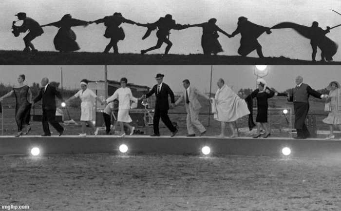 Ci parla di quel groviglio di presenze assenti e di assenze a loro modo presenti di cui è intessuta la nostra esistenza, delle ombre di chi non c’è più, dei fantasmi di tutte le vite e le vie cui abbiamo rinunciato e che non abbiamo scelto di percorrere e perciò tornano a tormentarci e a interrogarci (penso a diversi capolavori di Fellini e a 8½ su tutti), e sempre ci parla del fantasma della Morte che gioca a scacchi con ognuno di noi e proietta la sua ombra cupa su ogni nostro istante di vita (penso ovviamente alla serie di apparizioni pallide e spettrali della Morte ne Il settimo sigillo di Bergman, fino alla danza finale delle ombre dei cavalieri e di tutti i personaggi del film guidata dalla Morte, così simile nel suo spirito alla coreografia finale di 8 e mezzo in cui Guido/Mastroianni/Fellini balla in cerchio con tutte le persone che hanno segnato e lasciato la sua vita e con tutti i personaggi del film che non ha girato. Ci parla di tutto ciò che non riusciamo a ricordare né a dimenticare (penso ad Hiroshima, mon amour di Resnais, ai fantasmi della memoria individuale più segreta e incomunicabile che s’intrecciano ai fantasmi della memoria storico-collettiva di una nazione ferita dalla bomba atomica), o dei fantasmi fabbricati e modellati dal rimpianto e dalla nostalgia, dal rimorso e dal rimosso (mi sovvengono gli spettri materializzati e le materializzazioni spettrali sul pianeta Solaris nel capolavoro omonimo di A. Tarkovskij).