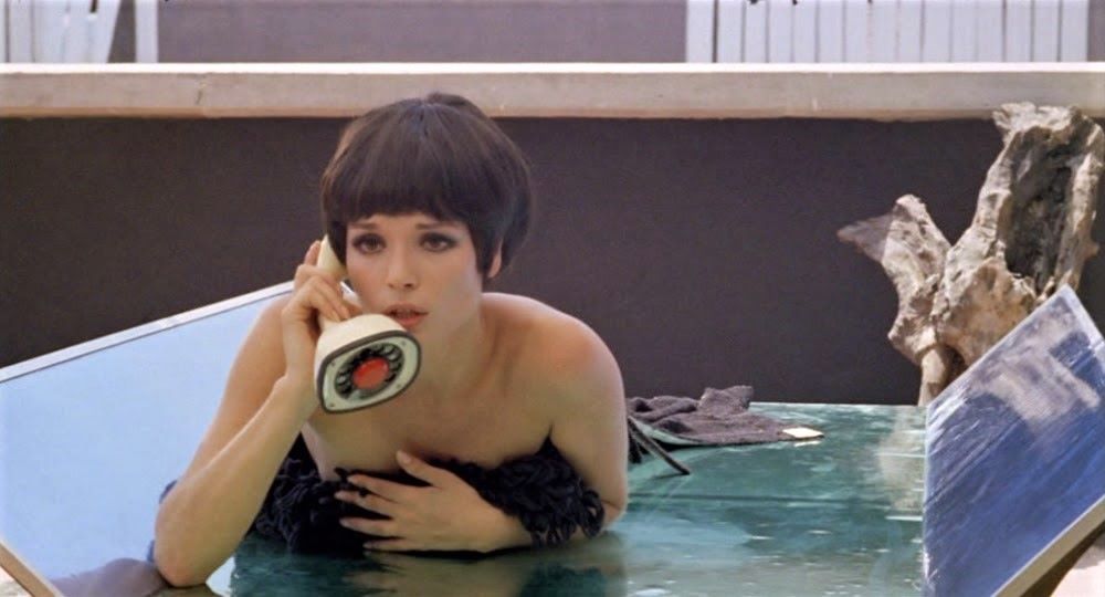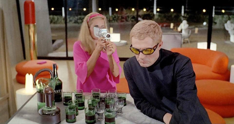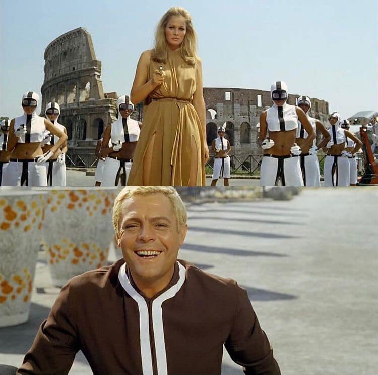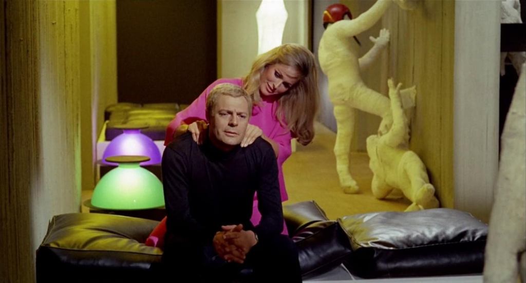 Immersi in una scenografia estremamente pop, optical e colorata sia nel design d’arredo quanto nei costumi ispirati alla Space Age, i personaggi si muovono a ritmo di musica, una Spiral Waltz (il titolo del tema principale della colonna sonora composta da Piero Piccioni e vocalizzata da Mina) che muta con le azioni dei protagonisti: la vittima Marcello (Marcello Mastroianni) e la cacciatrice Caroline (Ursula Andress).
