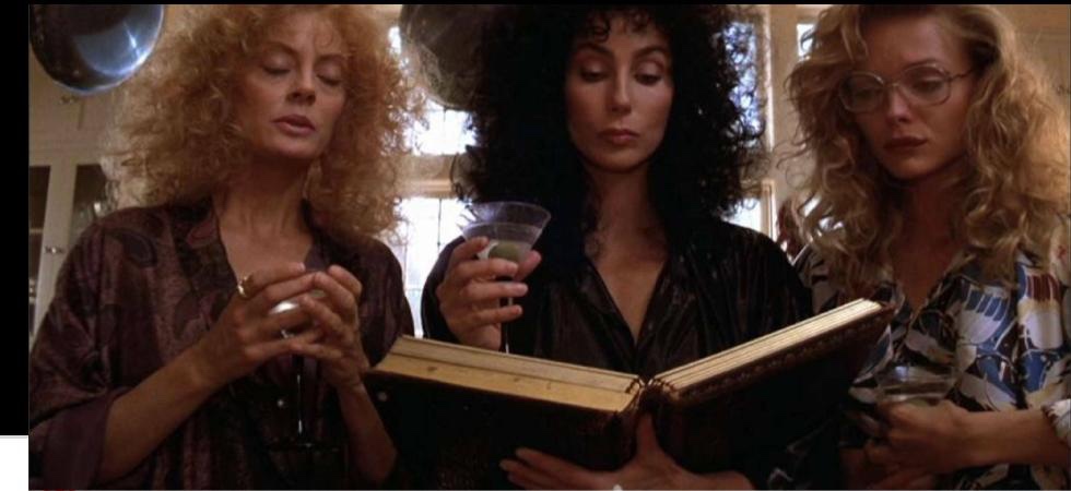 Questo è ciò che accade nella immaginaria cittadina di Eastwick, tranquillo ed incolore angolo del New England, dove l’unico passatempo dei suoi abitanti è quello di sparlare di tutto e tutti. È qui che vivono le tre protagoniste: la bruna Alexandra Medford(Cher), vedova e abile scultrice di statuine; la rossa e timida Jane Spofford (Susan Sarandon), single e sterile, che insegna musica e suona la viola; la bionda e dolce Sukie Ridgemont (Michelle Pfifer) giovane madre di sei figli, divorziata e dipendente di un quotidiano locale per cui scrive, gestito dai religiosissimi coniugi Clyde e Felicia Alden (Veronica Cartwright).