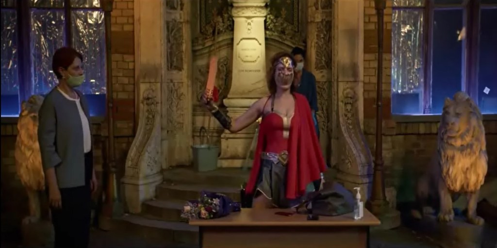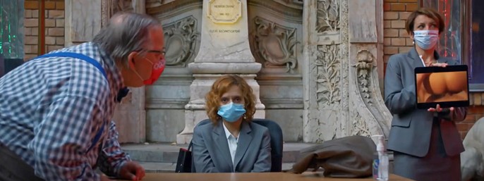 A chi scrive non era ancora capitato di assistere a un film in cui ci sono intere scene, tra l’altro ricche di dialoghi, in cui tutti i protagonisti indossano le mascherine. Nella Romania del 2020 in cui il film è girato, anche data la povertà di mezzi disponibili a confronto delle produzioni mainstream, si è trattato innanzitutto di una misura di sicurezza. Ma il tratto realistico che ne risulta è pienamente coerente con il tipo di cinema che Radu Jude propone. Inoltre il tipo di discussione cui assistiamo nella terza parte del film, quella del “processo” dei genitori alla insegnante Emi, risulta così molto più allusivamente riferita non solo e non tanto al caso del video erotico online della insegnante, quanto al tipo di discussioni cui si assiste spesso sulla pandemia.