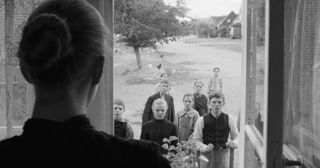 Il pericoloso indottrinamento a valori assoluti, basati su ordine, rigore e obbedienza non può che trovare soddisfacimento nella sopraffazione e prevaricazione a danno dei più deboli. Se i misteriosi incidenti appaiono inizialmente giustificati come meritato castigo nei confronti di adulti dediti a crudeltà e nefandezze (il dottore ne rappresenta la più vivida espressione), cominciano a perdere di significato e tramutarsi in feroce abitudine nel momento in cui le violenze sono rivolte verso i più deboli. Il male perpetrato ai danni di Sigi e Karli sono diretta emanazione di una legge morale basata sull’applicazione corrotta di idee corrotte. Haneke “impegna” lo spettatore con un rigore narrativo gelido e sfuggente, caratterizzato da immagini fisse ispirate ad alcune istantanee dell’epoca. I personaggi sono distanti, i loro volti tetri e impassibili, eccezion fatta per il maestro e la bambinaia Eva, i soli capaci di provare amore e compassione verso gli altri. La ricerca e ricostruzione storica pur non ispirandosi a nessuna vicenda reale risulta accuratissima, così come la scelta dei bambini protagonisti, grazie al quale un villaggio anonimo e rurale diviene ben presto un “villaggio dei dannati” capitanato da un gruppo di ragazzini avvolti da un’abbagliante e raggelante bianco e nero dove le chiese assomigliano a tribunali e le funzioni a condanne morali. Il regista lavora molto sull’aspetto formale, la scelta del bianco e nero è anche un modo di allontanarsi dalla materia trattata e aumentare quella distanza che rende Il nastro bianco un’opera ostica, spigolosa, a tratti indigesta, ma terribilmente vera.