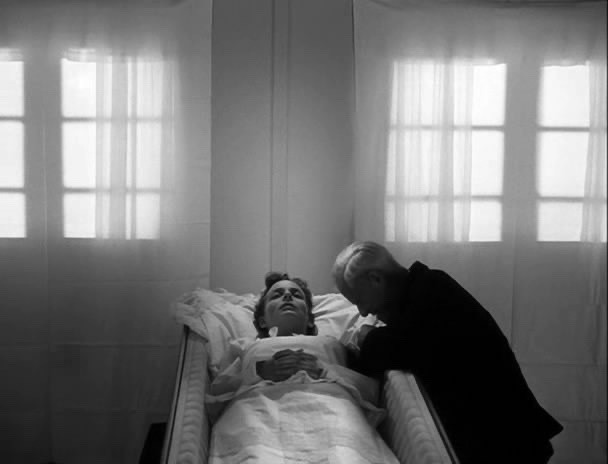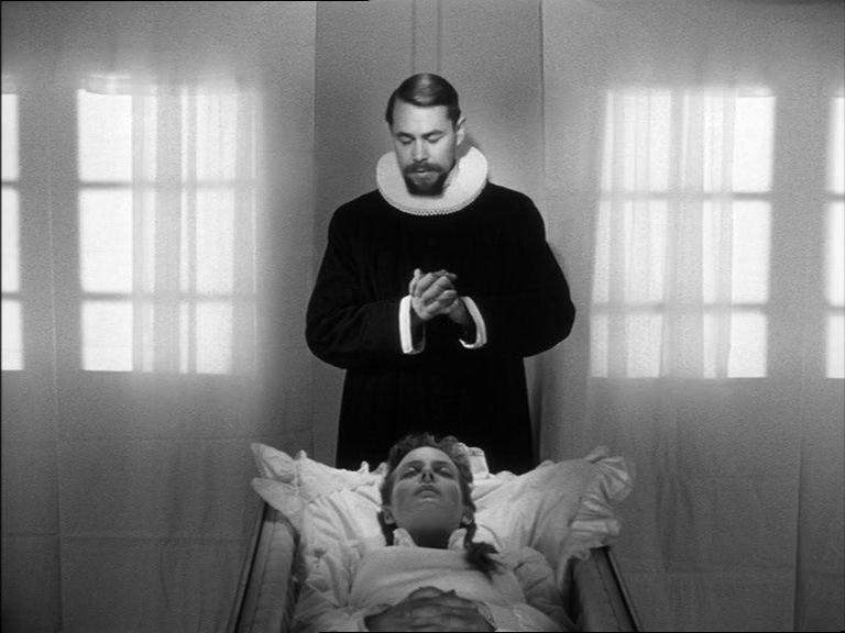 Ma chi è il Cristo vivente incarnato in Johannes se non l’essere umano nelle sue insondabili possibilità? Prova ne sia che quando Inger muore per il parto, Johannes, dopo una breve scomparsa – lascia la fattoria con un biglietto dove sono riportate le parole del Vangelo (Giov.13,33): «Io me ne vado e voi mi cercherete, ma dove vado io voi non potete venire» – , ritorna improvvisamente fra lo stupore di tutti che lo credevano perduto per sempre. Giunge così nel corso della cerimonia funebre – mentre la scena è circonfusa dal bianco accecante dell’ambiente dove si stagliano, per contrasto, gli abiti scuri dei presenti – e per la prima volta è perfettamente in sé. E in sé, proprio nella sua perfetta umanità, Johannes si appresta a compiere il miracolo al quale nessuno vuole dare credito, nemmeno Mikkel, il marito di Inger: desideroso di riaverla, disperato, mentre la piange morta. Al padre che gli dice per consolarlo: «la sua anima è vicina a Dio. Non è qui, lo vedi bene»,ribatte fra le lacrime: «ma il suo corpo, io amavo anche il suo corpo!». Lo spirito, per l’umanità, non è mai solo: nella morte, è labellezza della corporeità a restare indelebile nelricordo e nel bisogno dei vivi.