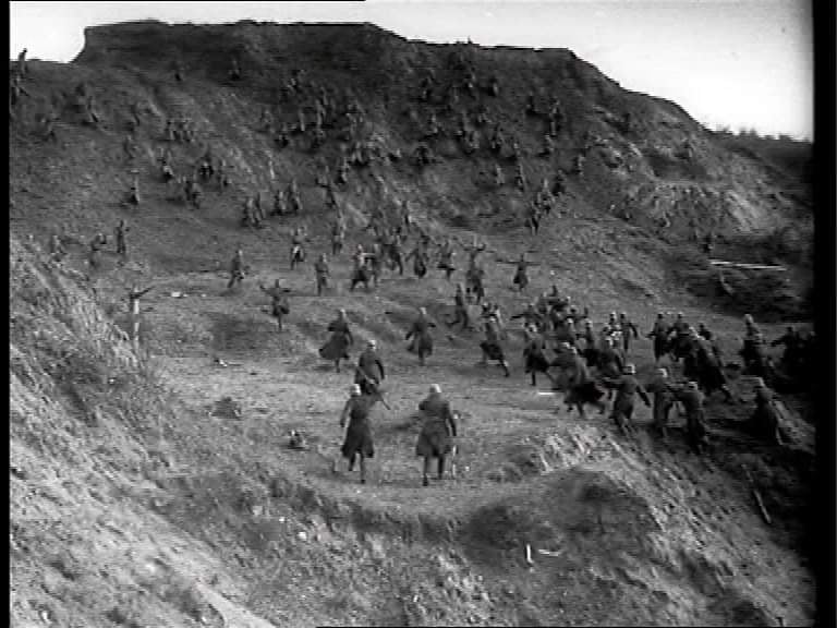 Tracciando continuamente con un montaggio alternato il parallelismo tra fronte e villaggio, Barnet include nello stesso suono il rumore della mitragliatrice e quello delle macchine nell’industria di calzature, guarda alla guerra come uno specchio in cui si riflettono orrore, ma anche amore paterno, retorica, opportunismo, ma anche desiderio, soprattutto di chi combatte, di terminare il conflitto.