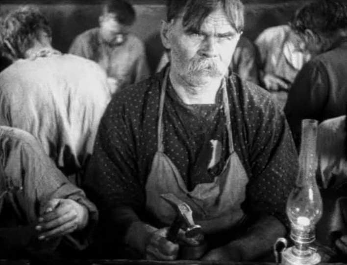 Sobborghi (Okraina), primo film sonoro del regista, risponde perfettamente a questo stile. In una remota cittadina di provincia, dove l’economia ruota esclusivamente intorno ad un calzaturificio e tutti sono calzolai, la lentezza del tempo sarà sconvolta dall’urto della Grande Storia, con la Prima guerra mondiale e la Rivoluzione d’Ottobre a scuotere i destini di un’umanità sospesa e a metterla alla prova.