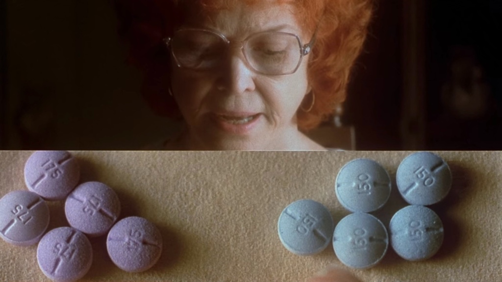 Sara invece, all’inizio morbosamente attaccata alla televisione e al conforto che le portava il cibo, incomincerà a prendere delle anfetamine per dimagrire e arrivare ad indossare in tv il tanto amato elegante vestito rosso. Un vestito che rappresenta il suo unico legame con una vecchia immagine di sé ormai da tempo persa, ricordo del marito morto e del rapporto non ancora completamente deteriorato con il figlio. Un appagamento artificiale, un’esigenza di essere riconosciuta, un dover nutrire il proprio ego, che sia di pillole o di cibo.