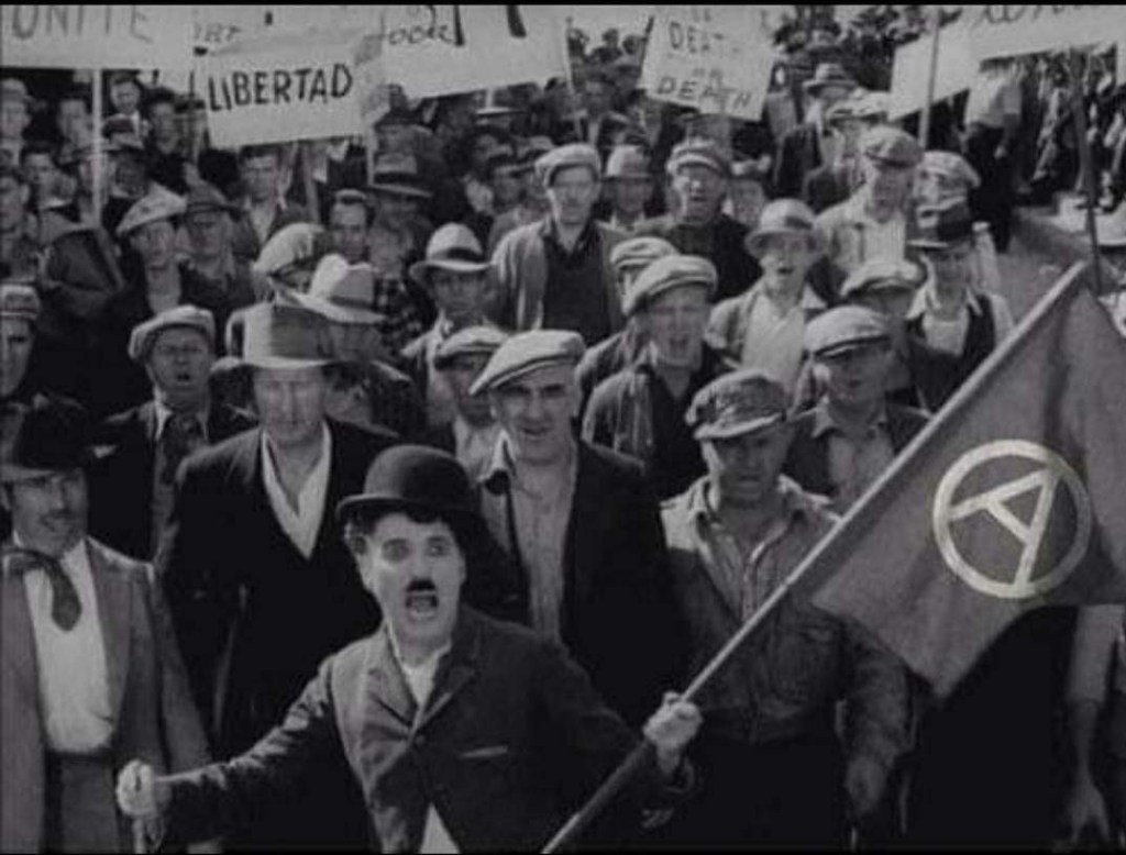 Insieme ingaggiano una lotta contro la società che non è rivoluzionaria ma è per la dignità. Miseria, illusione, alienazione, amore sì alternano con un ritmo travolgente in questo capolavoro intramontabile in cui Charlot incarna la sofferenza dei diseredati: ultimo degli ultimi, ridotto a ingranaggio, porta nel cuore una geniale furbizia che lo conduce a cavarsela nei momenti peggiori- si noti la disperazione di un uomo a che punto possa arrivare per addossarsi, in una scena, la colpa per farsi arrestare in modo da poter mangiare…, ma anche una commovente sensibilità e una voglia di non arrendersi come nell’immagine finale, quando lei piange disperata e lui, nonostante le avversità, la invita a sorridere, le infonde fiducia per incamminarsi mano nella mano sulla strada di un incerto futuro.