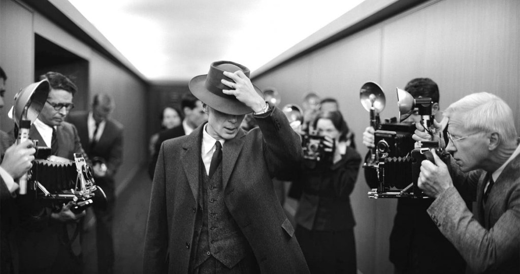Inoltre, come accennavo inizialmente, non si può non ricordare la magistrale sequenza del test Trinity nel deserto in cui Nolan (che non ha fatto ricorso alla computer grafica ma a efficacissimi effetti speciali analogici) ha sapientemente scelto di differire il suono assordante della detonazione sostituendolo inizialmente con il silenzio e il respiro di Oppenheimer e dei suoi attoniti colleghi. Questa sequenza lascia il posto ad un’altra scena strepitosa, quella nella sala in cui Oppenheimer viene fragorosamente accolto e acclamato dopo la riuscita del test e in cui tiene un breve discorso