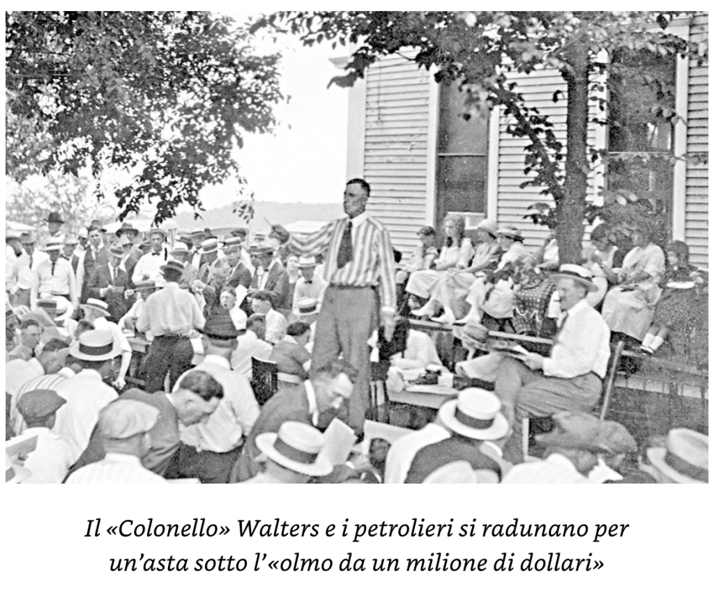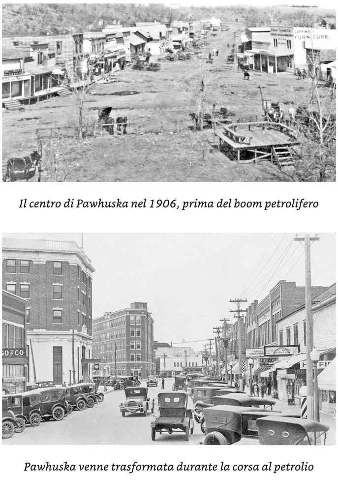 “Molti osage accorrevano per assistere all’eruzione di un pozzo spontaneo, accalcandosi per avere la visuale migliore, lo sguardo che seguiva il petrolio salire a quindici, venti, o persino trenta metri d’altezza.